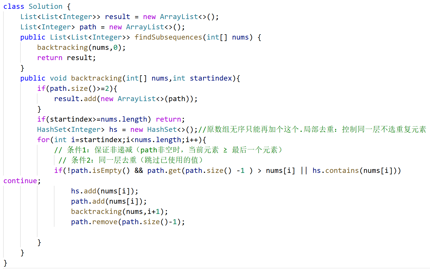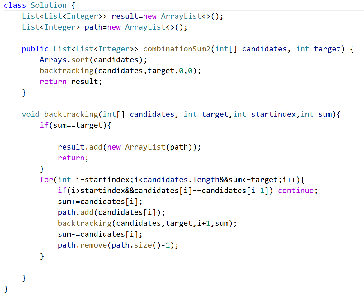 💥for里if(i>startindex&&candidates[i] == candidates[i-1]) continue; 可以保证解集不能有重复的组合