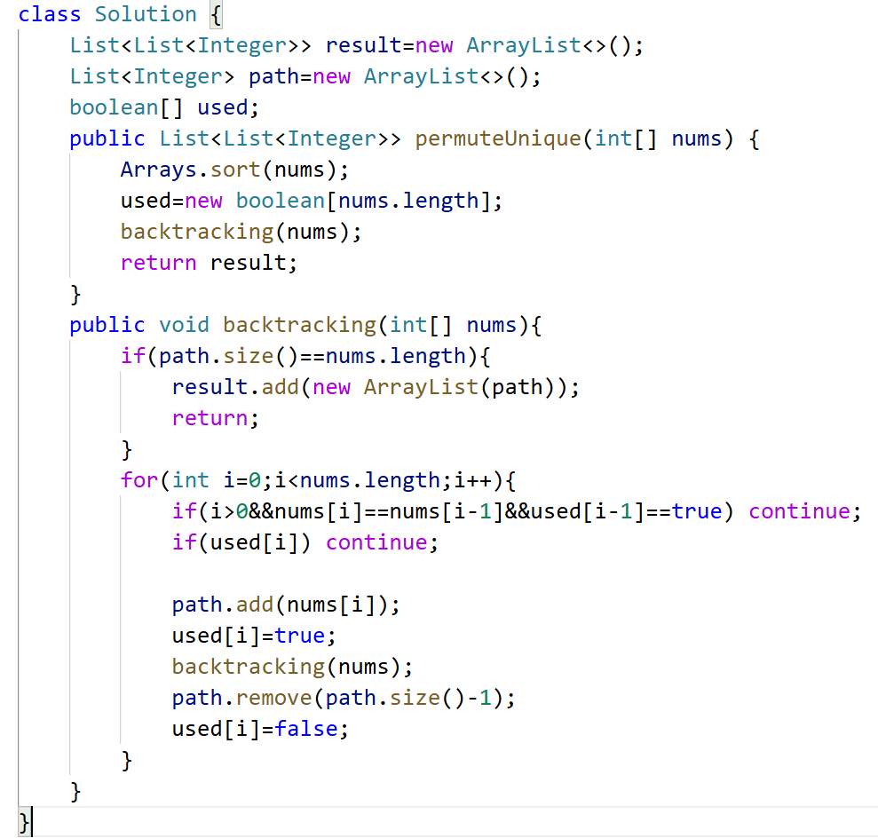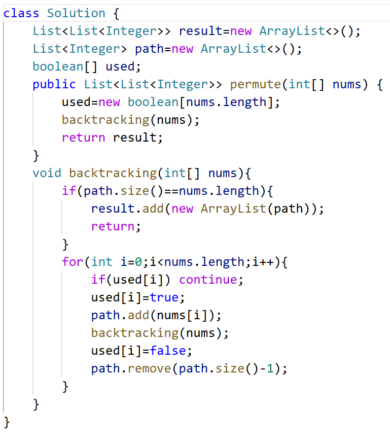 但排列问题需要布尔类型的used数组,记录此时path里都有哪些元素使用了,因为一个排列里一个元素只能使用一次。