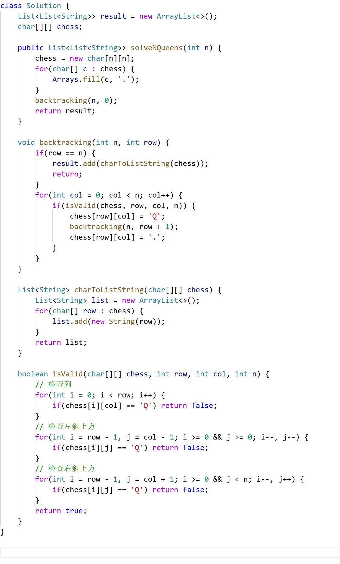 public void backtracking(int n,int row,char[][] chessboard){