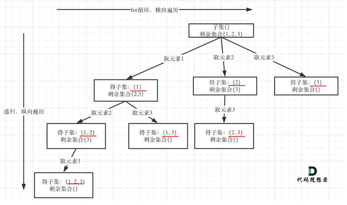 3. 回溯搜索的遍历过程:我怎么找答案。先根据for横向遍历摞一格,再根据递归纵向遍历直到叶子节点。每一颗树都是这样。