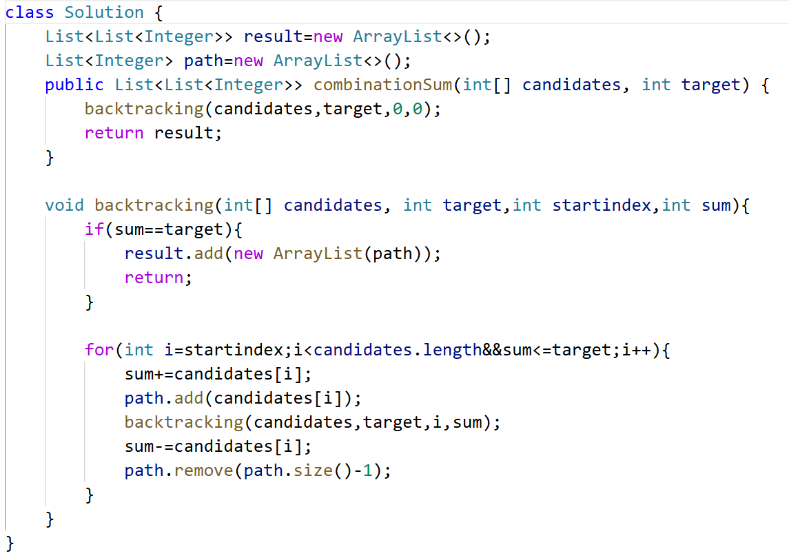 for里必须得是i<candidates.length&&sum<=target。要有后面那个剪枝条件,否则不小心超了就会一直递归导致栈内存爆了StackOverflowError。